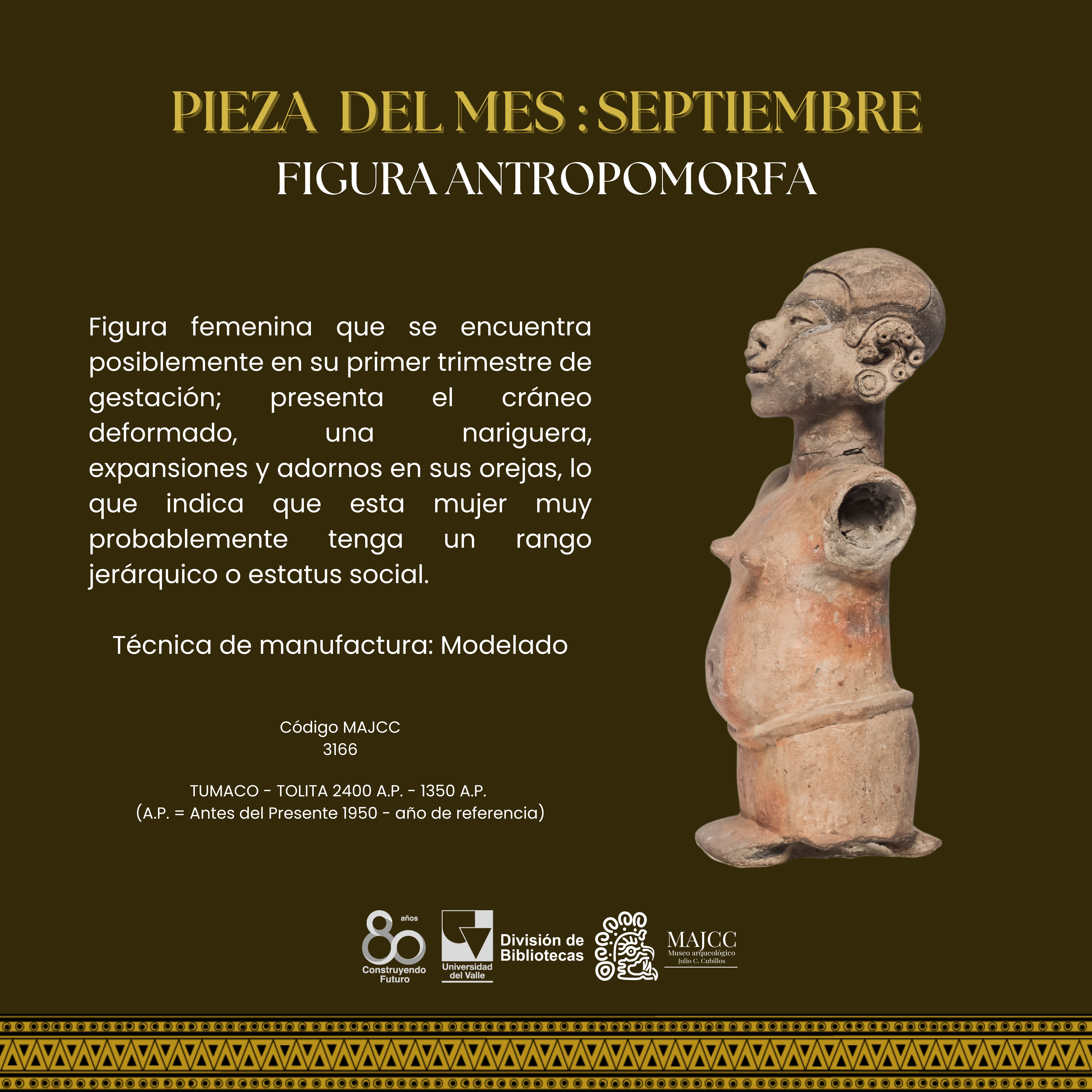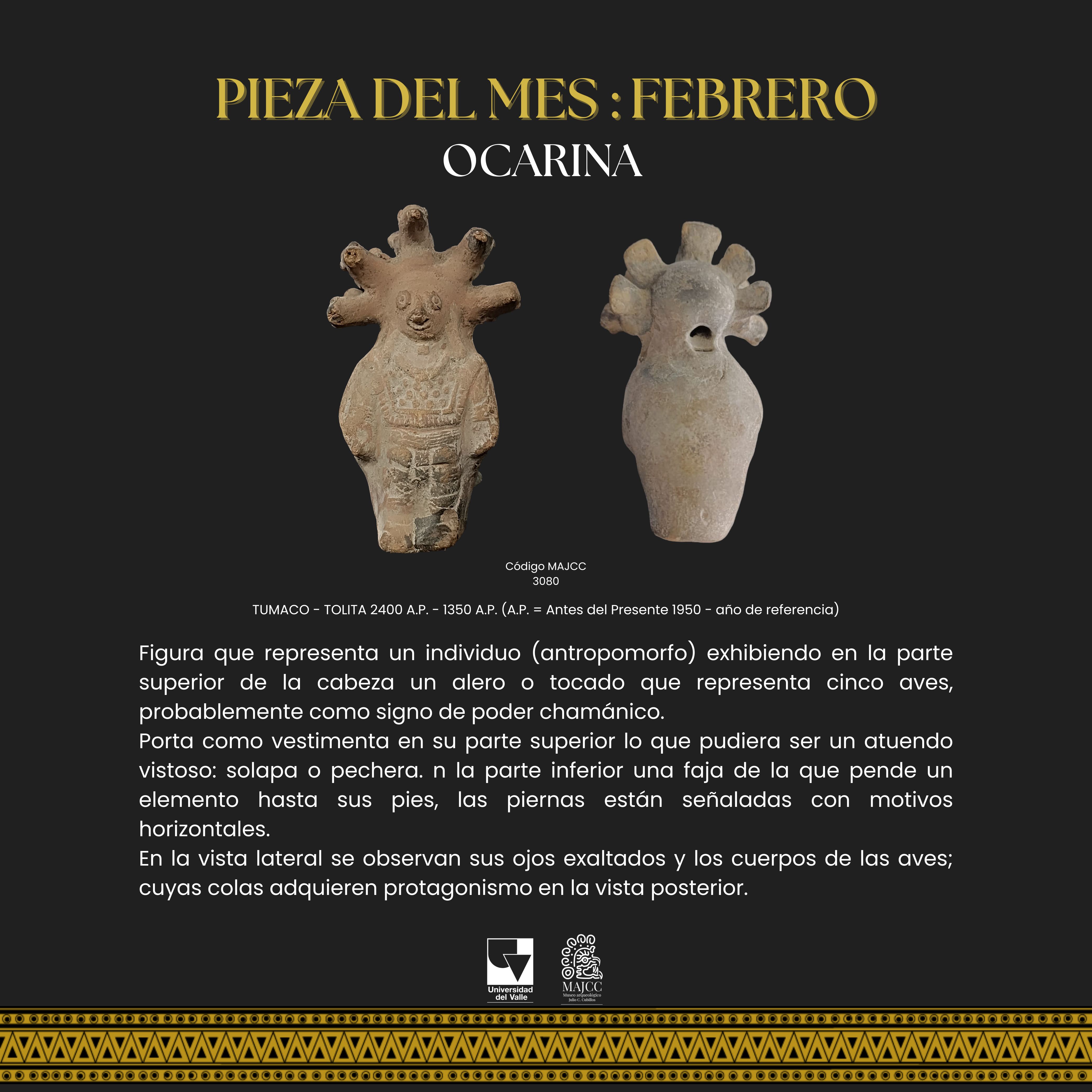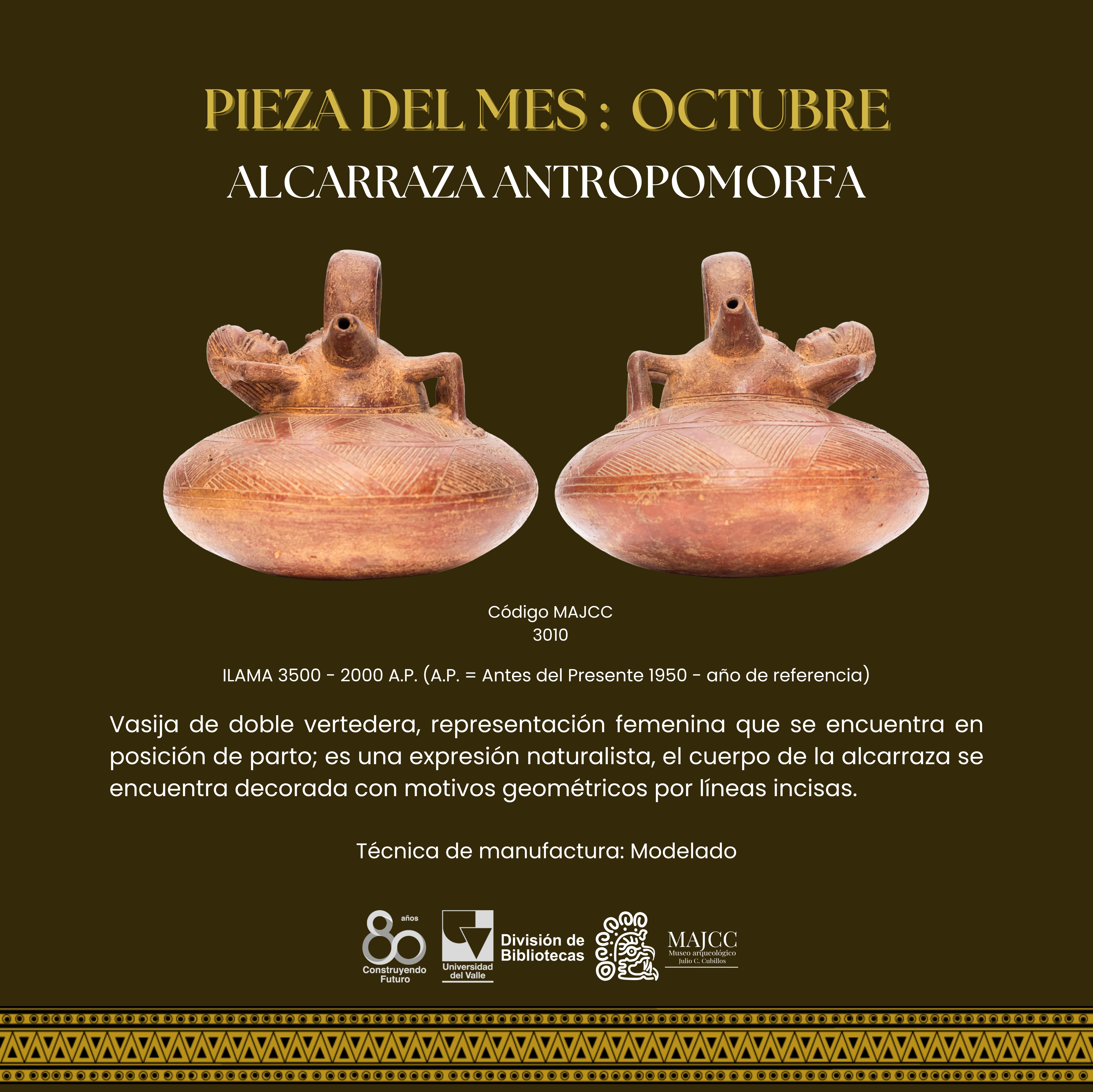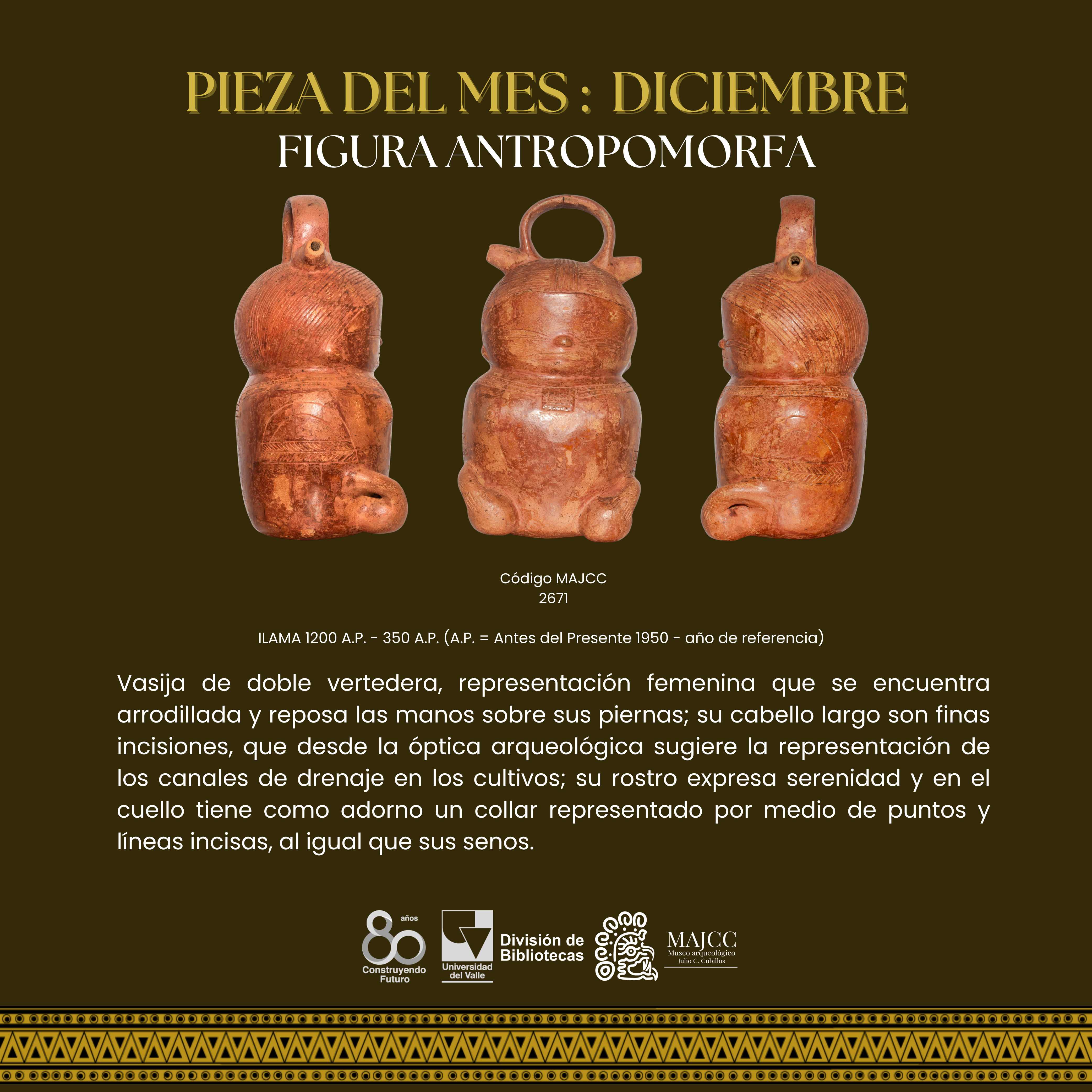 A partir del Boletín Museo y Comunidad, nace la Pieza del Mes. En este apartado, se divulgan las piezas de la colección MAJCC elegidas mes a mes en el Boletín Museo y Comunidad. Todos los espacios divulgados tienen como objetivo principal socializar los resultados de los proyectos que realiza el Museo, e invitar a la gente que se acerque al MAJCC y conozca el trabajo que se realiza sobre el patrimonio cultural-arqueológico del Suroccidente de Colombia.