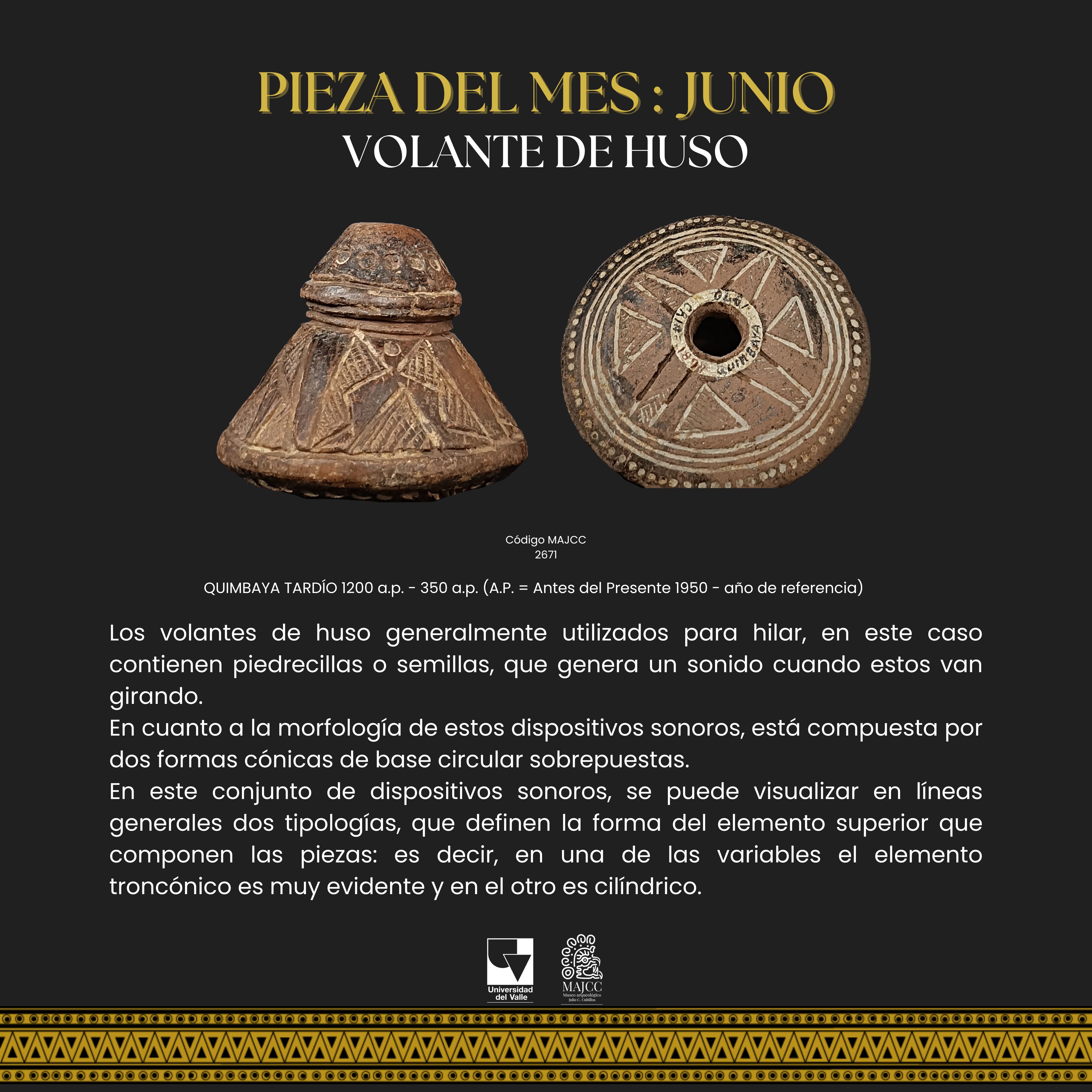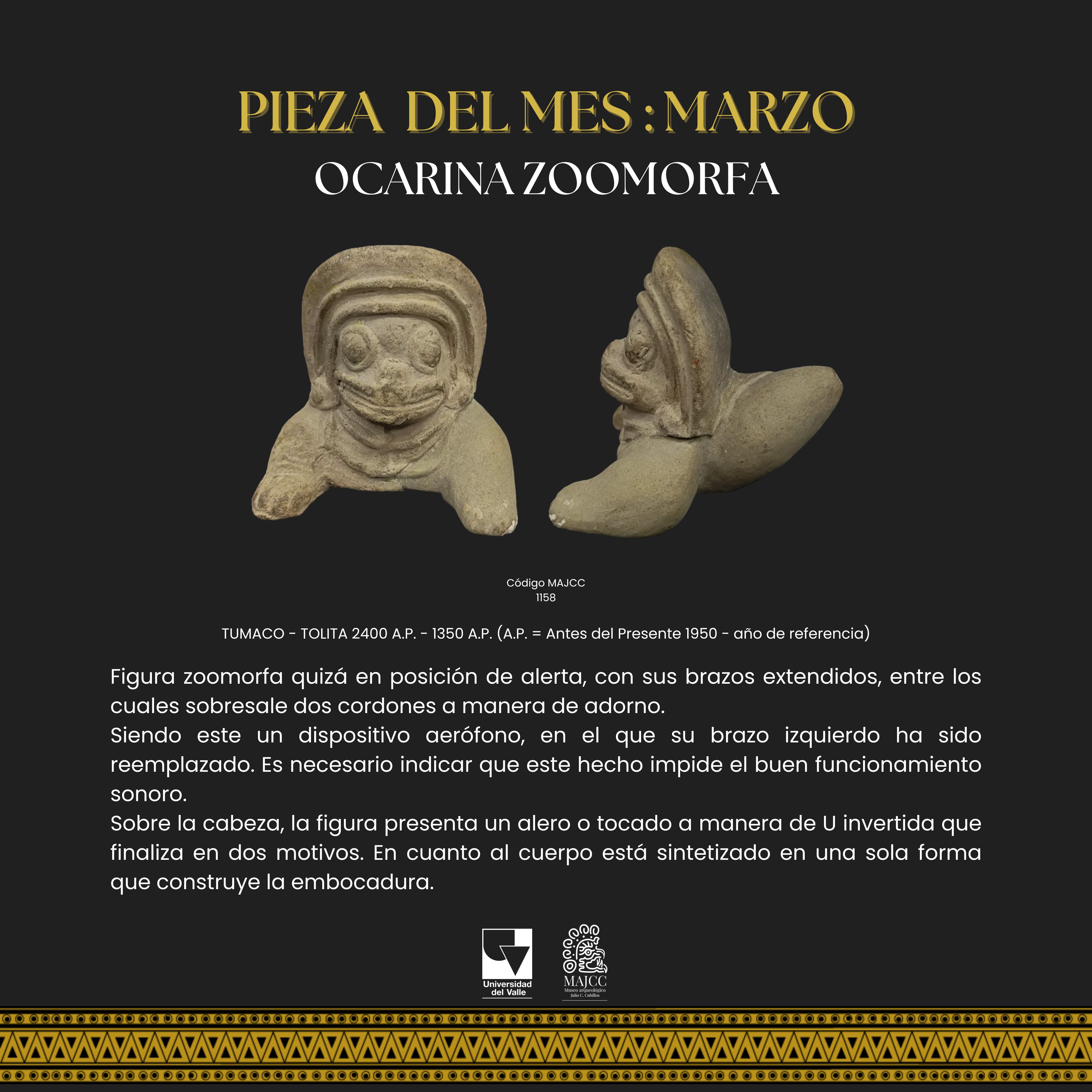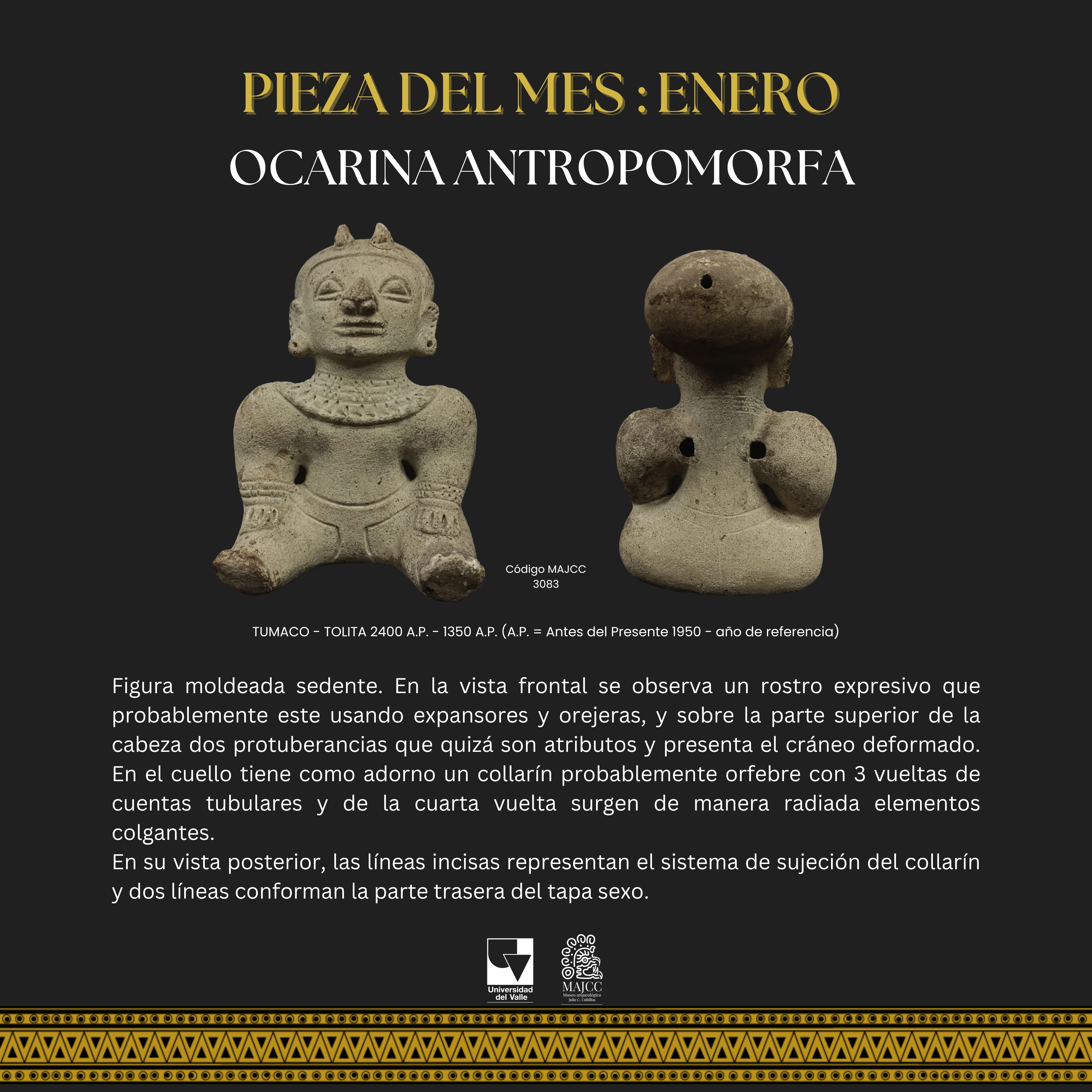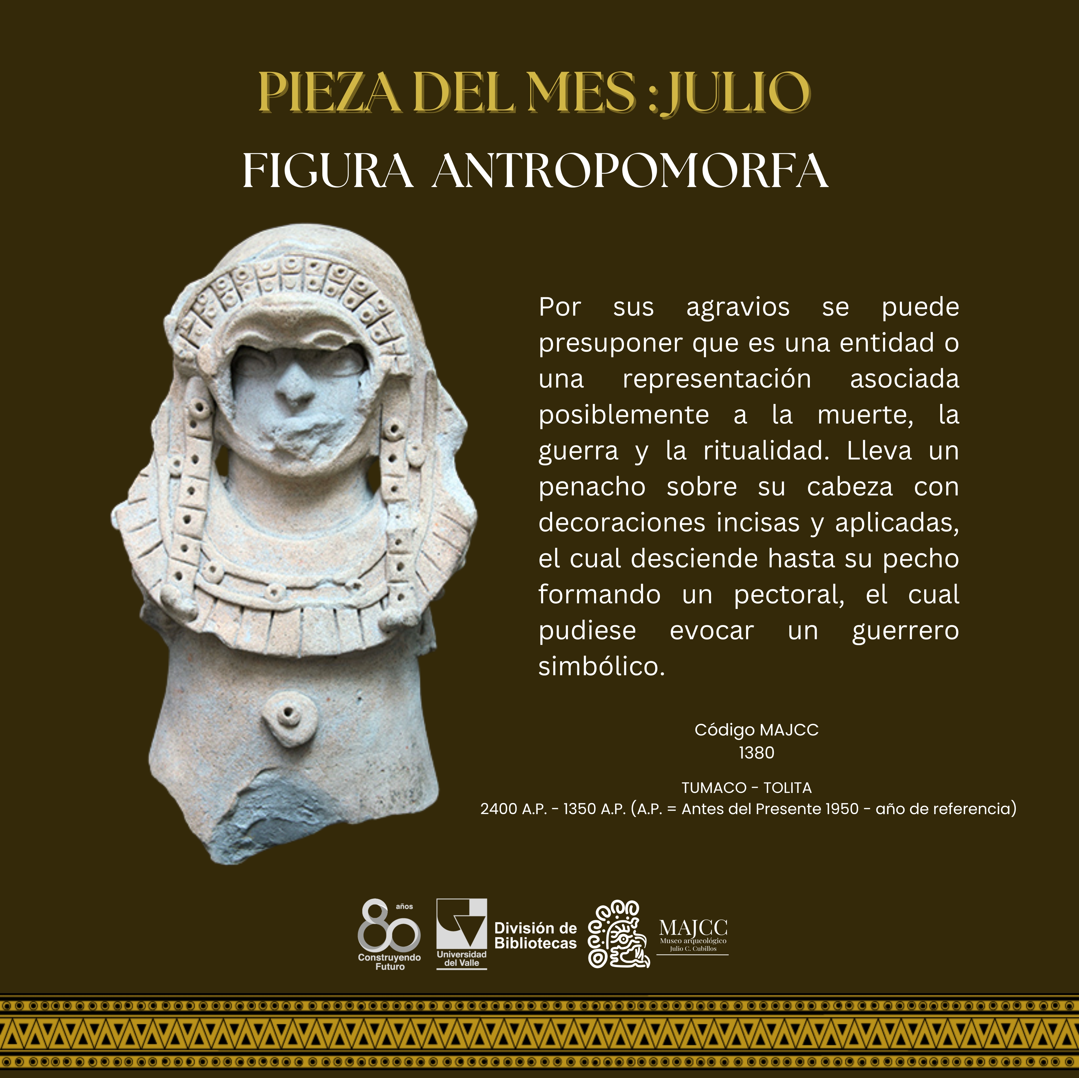 A partir del Boletín Museo y Comunidad, nace la Pieza del Mes. En este apartado, se divulgan las piezas de la colección MAJCC elegidas mes a mes en el Boletín Museo y Comunidad. Todos los espacios divulgados tienen como objetivo principal socializar los resultados de los proyectos que realiza el Museo, e invitar a la gente que se acerque al MAJCC y conozca el trabajo que se realiza sobre el patrimonio cultural-arqueológico del Suroccidente de Colombia.